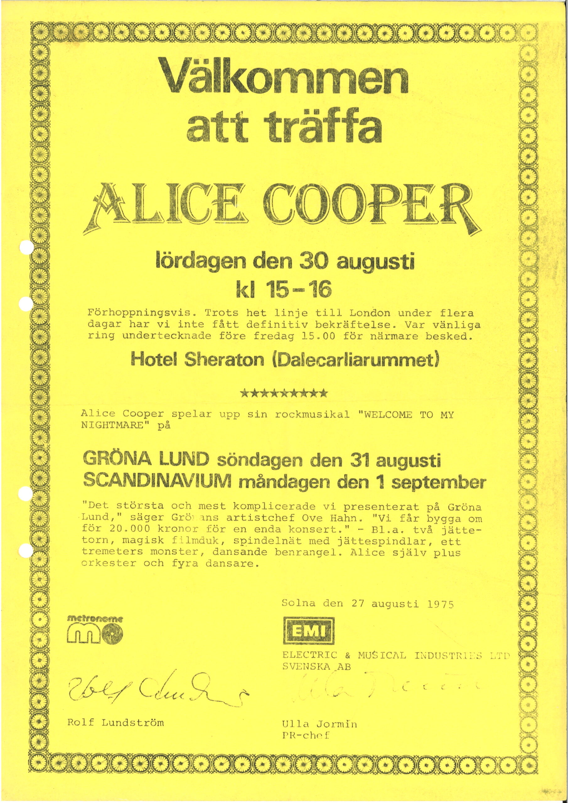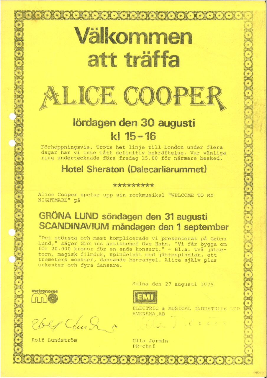 ”Wellcome to my Nightmare” hette Alice Coppers show som kom till Stora scen för ett 75 minuters uppträdande. Scenen hade fått byggas ut för att få plats med Alice alla teatraliska kulisser.